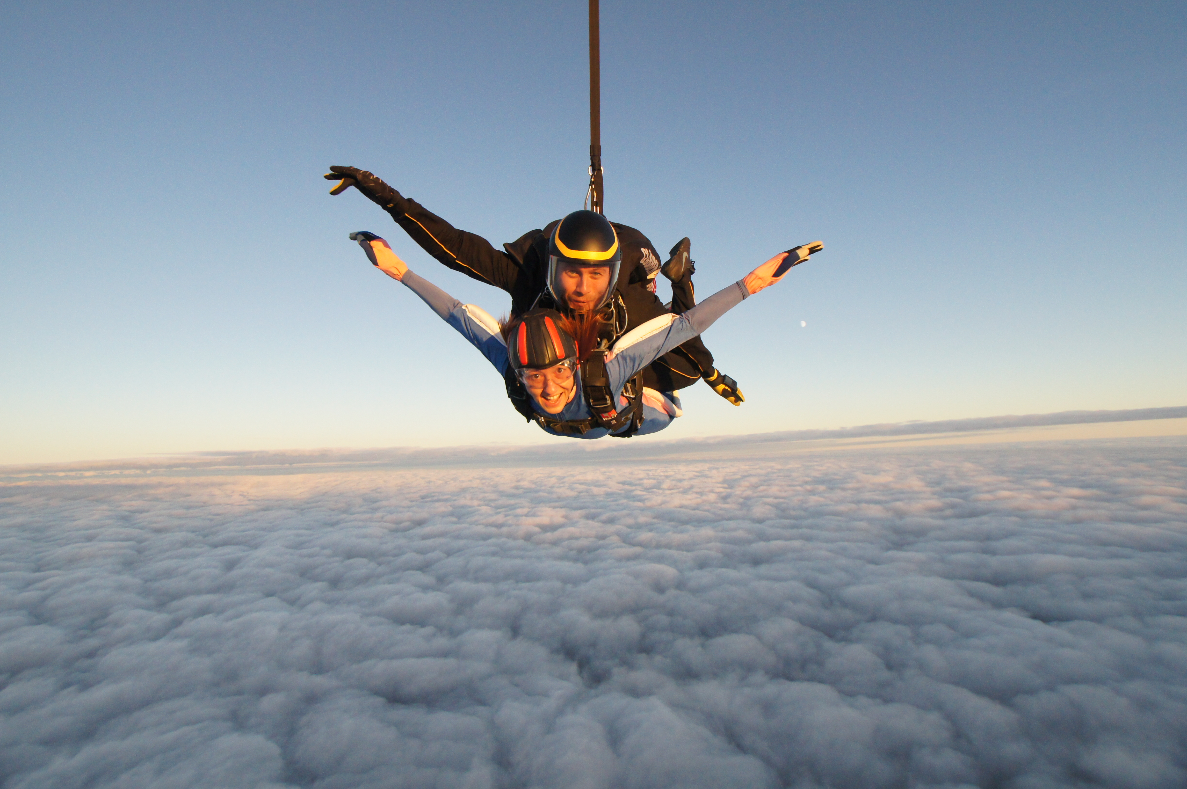 Likās, ka es atsperšos pret pūkaino mākoņu segu. Bija pārsteiguma sajūta, kad visā ātrumā ielidojām tajā. Un tad sākumā blāvi, bet pēc tam skaidrāk un skaidrāk sāka parādīties zeme un varēja redzēt pusapaļu horizontu. Tad virs mums izšāvās un lepni izpletās izpletnis. Līdz ar to mūsu ātrums samazinājās un mēs, lēnām planējot, sākām tuvoties zemei. Tas bija skaisti.